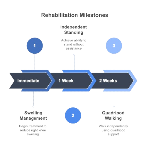 At the time of discharge, he was hemodynamically stable, was able to sit and stand independently. He was independent for activities of daily living. Significant reduction in Knee swelling & pain was n oted and he was a ble to walk with Q uadri pod support.